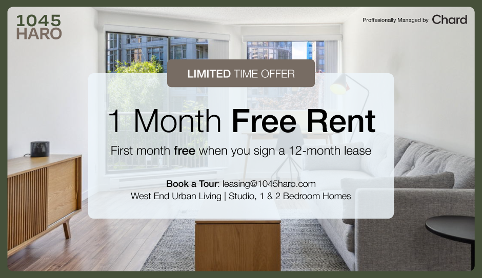 For a limited time, enjoy 1 month of free rent when you sign a 12-month lease. These well-maintained rental homes offer comfort and convenience in the heart of Downtown Vancouver's West End.